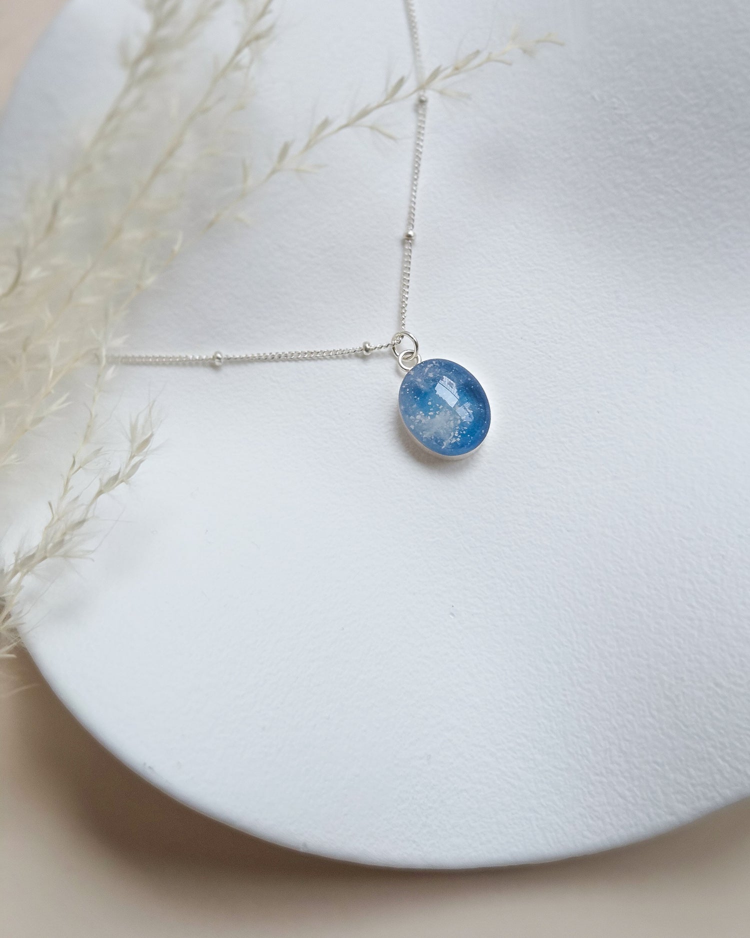 Pictured here is the 12x10 Cremation Oval Necklace in 925 Sterling Silver on a Satellite chain. Inclusions: ashes, white pigment, and Pacific Blue pigment.