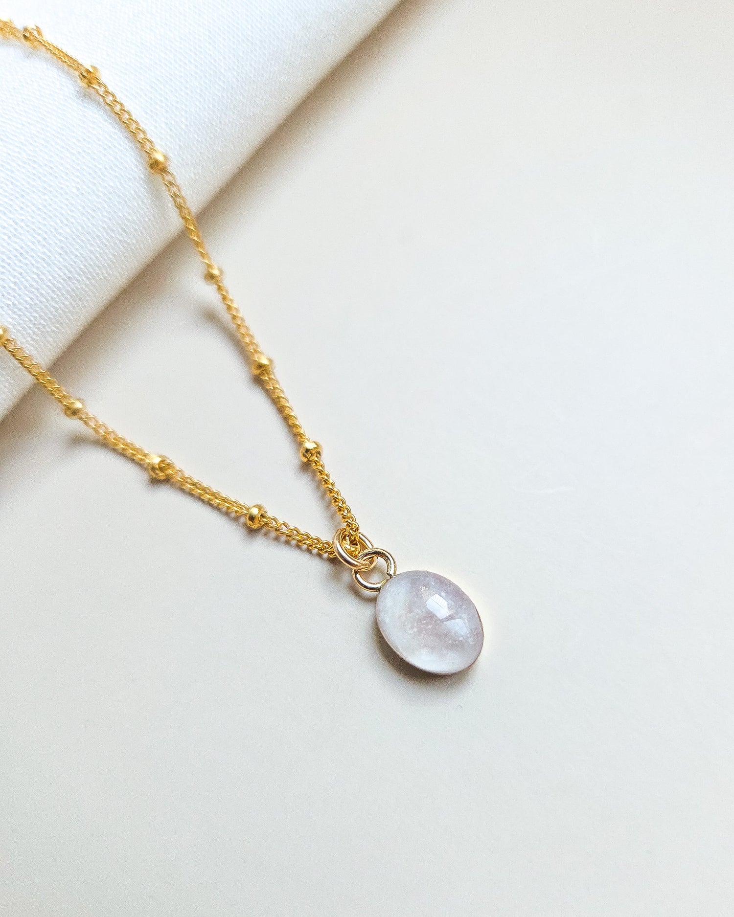 Pictured here is the 8x6 Cremation Oval Necklace in 14K Gold filled, on a Satellite chain. Inclusions and enhancements: ashes, white and blush pink pigment, iridescent sparkle.