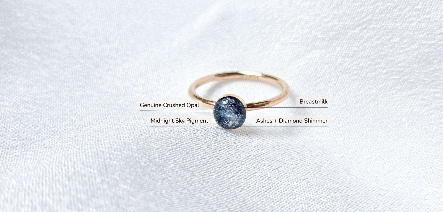 Explore The Details In Video (external link)This design brings the sky to her - a reminder that her love still holds him close. His ashes are blended with a soft diamond shimmer to sparkle like distant stars, breastmilk forms the "Milky Way," and crushed opal within Midnight Blue pigment add depth and light.