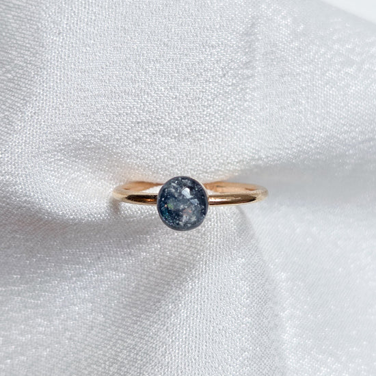 Pictured is a custom ring in 925 Sterling Silver, with ashes, iridescence and Opal mylar flakes. -