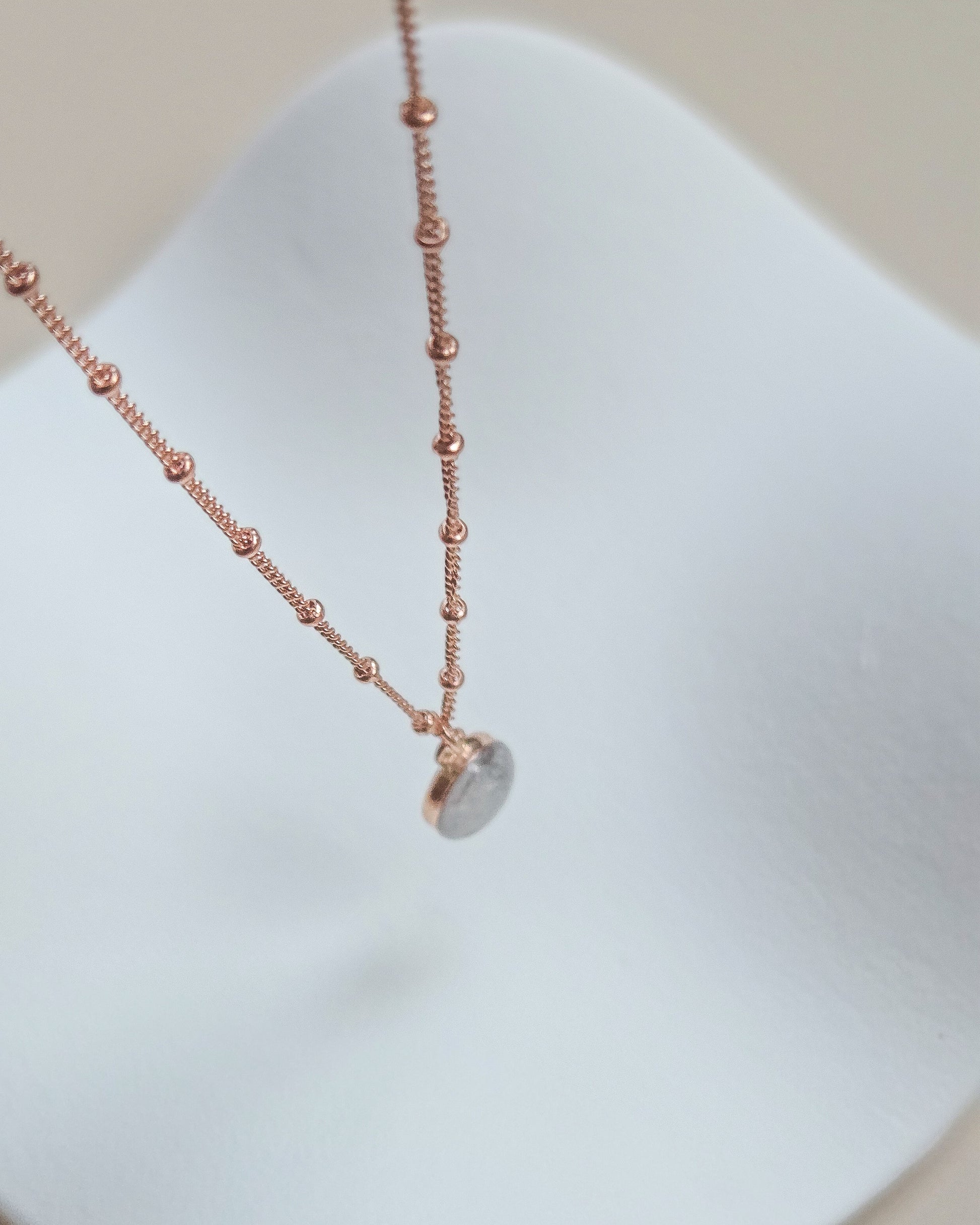 This memorial necklace is designed to honour your loved one with elegance, durability, and everyday wear. Created with 14K Rose Gold filled metal - a long-lasting, hypoallergenic option that holds its shine beautifully for everyday wear. At the heart of the necklace dangles a custom stone infused with your loved one's ashes, gently layered with a soft white iridescent shimmer. The effect is subtle, catching light in a way that feels intimate and meaningful.