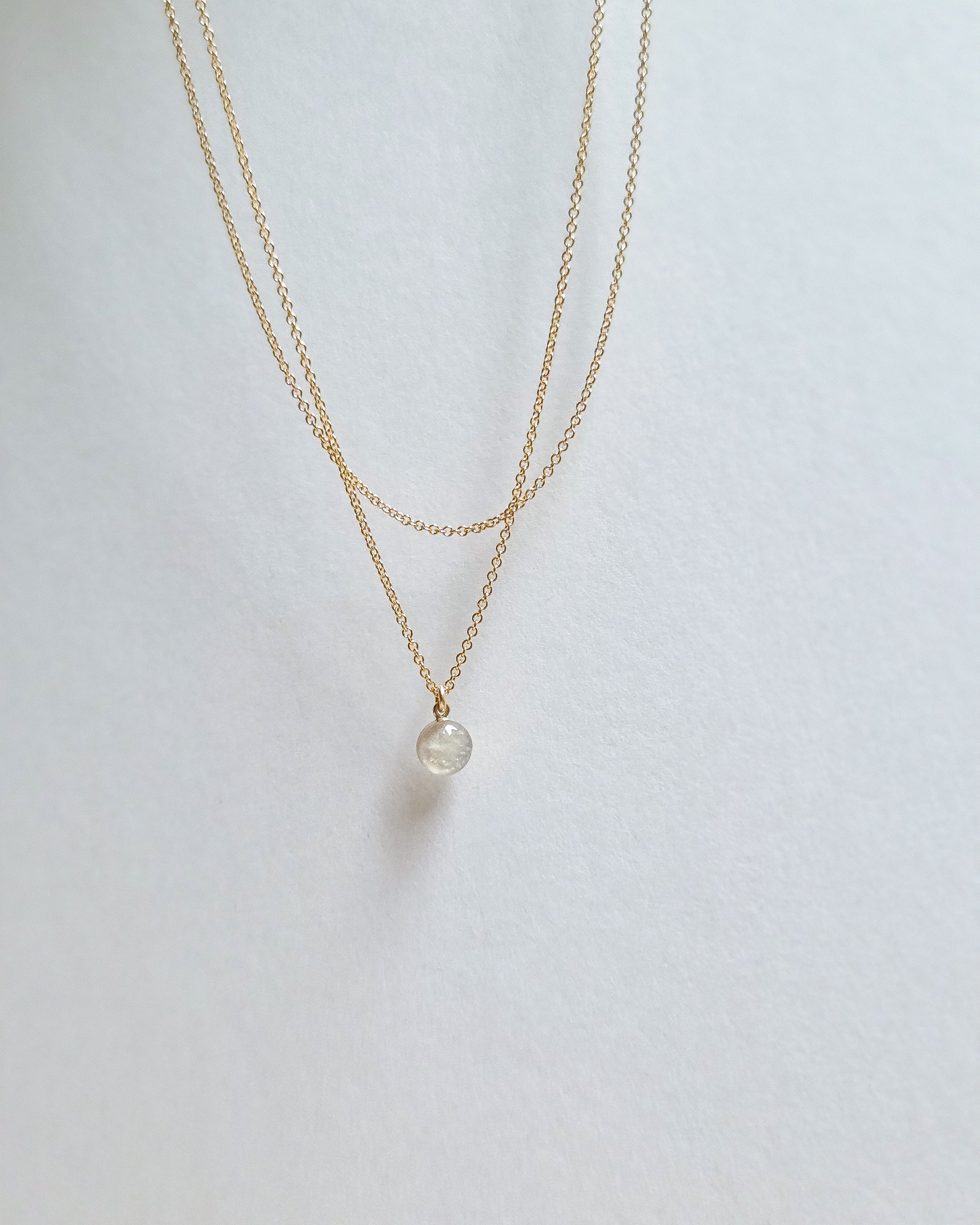 This modern, minimal necklace features two delicate cable chains, perfectly connected for an easy layered look. Created with 925 Sterling Silver or 14K Gold filled metal - a long-lasting, hypoallergenic option that holds its shine beautifully for everyday wear. The top strand sits at approximately 16", resting gently at collar bone height, while the lower strand falls around 17" for a subtle drop. At the heart of the necklace dangles a custom stone infused with your loved one's ashes, gently layered with a soft white iridescent shimmer. The effect is subtle, catching light in a way that feels intimate and meaningful.